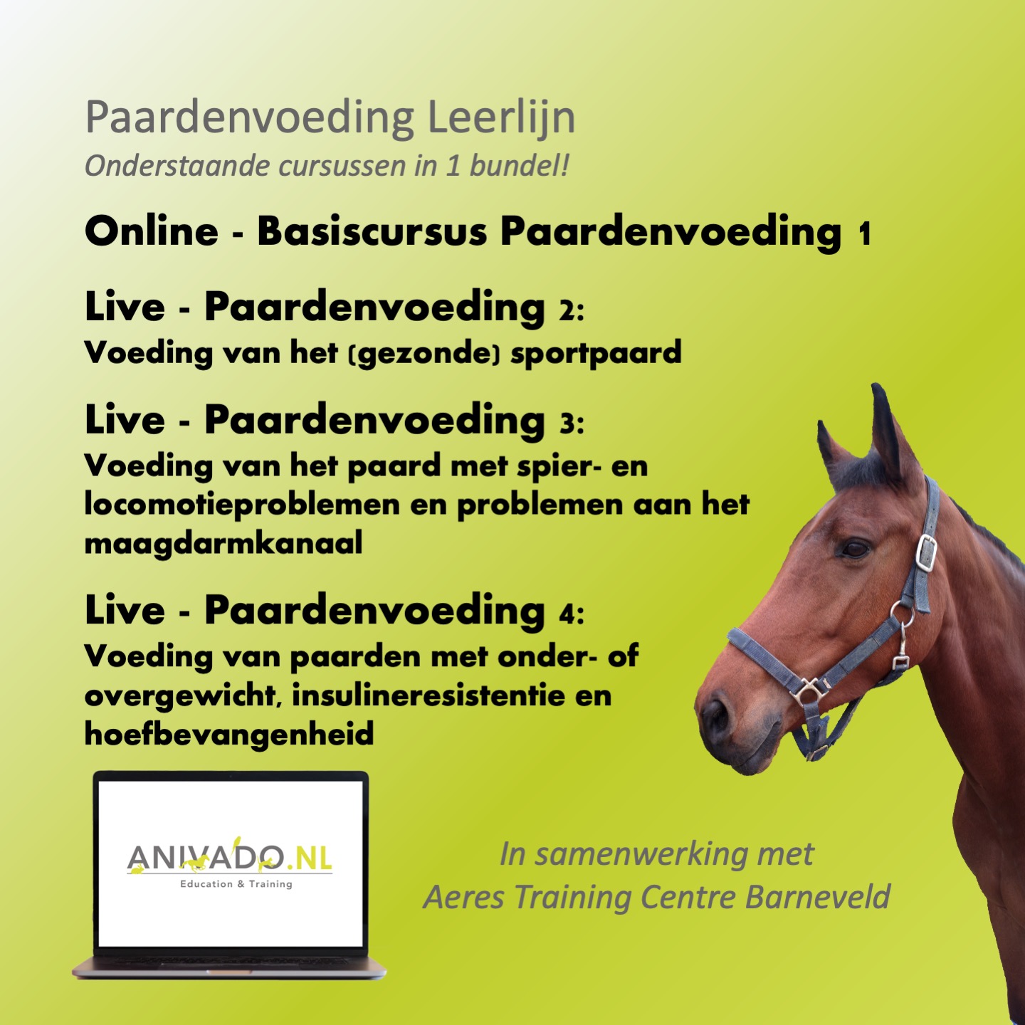 ANIVADO biedt in samenwerking met het Aeres Training Centre Barneveld (voorheen Cursuscentrum Dierverzorging) en Dr. ing D.A. van Doorn MSc enkele Nederlandstalige cursussen Paardenvoeding aan. Na het volgen van een online basiscursus kunnen geïnteresseerden deelnemen aan "live" cursussen die gegeven worden bij Aeres Training Centre Barneveld. Om deel te nemen aan de "live" cursussen Paardenvoeding dient u vooraf de Online Basiscursus Paardenvoeding te volgen. U kunt de onlinecursus via deze website aanschaffen (125 euro (excl. btw)) en direct starten met de Online Basiscursus. In sommige gevallen kunt u vrijstelling krijgen voor de online basiscursus. U dient dan de verkorte Basiscursus te volgen.