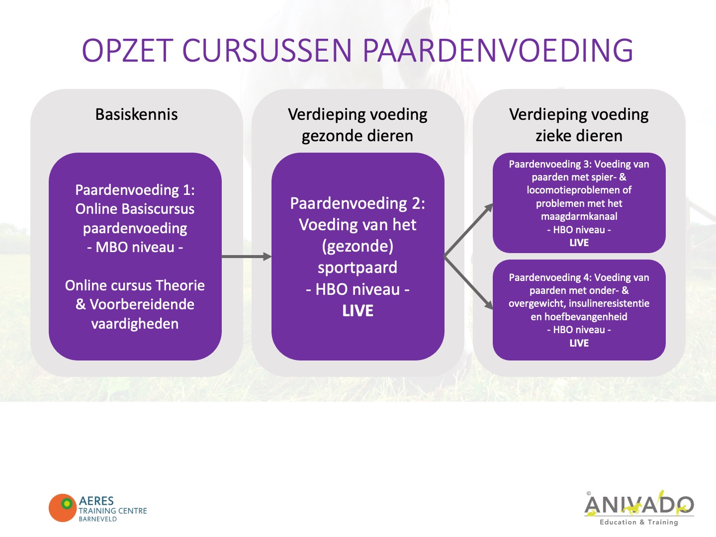 Hieronder ziet u een overzicht van de cursusflow die u kunt volgen m.b.t. de Nederlandstalige cursussen paardenvoeding i.s.m. Aeres Training Centre Barneveld. Klik hier voor ons volledige cursusaanbod. De cursussen vindt U onderaan de pagina.